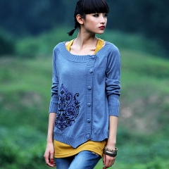 正品 2014春装新款 女 绣花针织衫 开衫外套浮桑初 蓝色